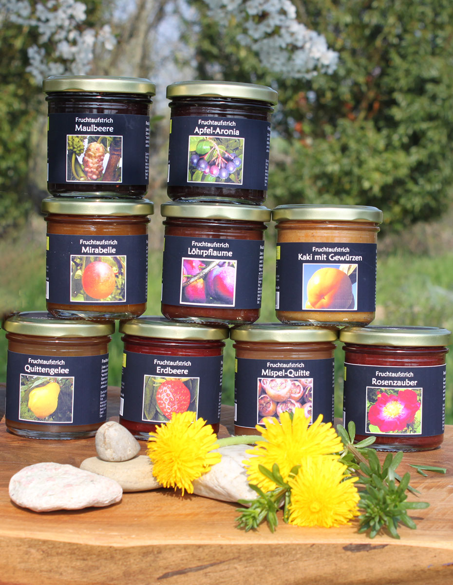Unsere Fruchtaufstriche haben im Vergleich zu Konfitüren einen viel höheren Fruchtanteil. Wir verwenden nur vollreife und gesunde Früchte von schmackhaften Sorten, Apfelpektin als Gelierhilfe, heimischen Bioland Zucker und Zitronensaft in Bioqualität. Chemische Geschmacks- und Konservierungsstoffe kommen bei uns nicht ins Glas.