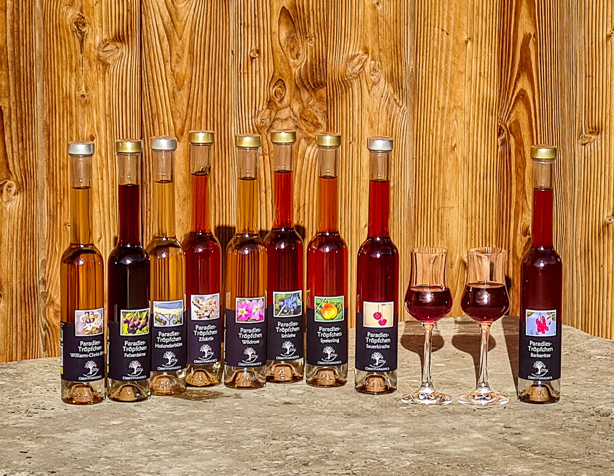 Für unsere Paradies-Tröpfchen bannen wir die Essenz unseres Obstparadies` in Flaschen. Die große Sortenvielfalt spiegelt sich in diesen Auszugslikören aus handverlesenen Früchten und Blüten wieder. Von Ackerdistel bis Zibärtle bietet sich eine riesiges Geschmacksspektrum und ein Blumenstrauß an Aromen- und das ganz ohne Zugabe von künstlichem Aroma. Egal ob Pur, im Sekt, als Pralinenfüllung oder zu Desserts. Unsere Paradies-Tröpfchen sind immer ein Genuss.